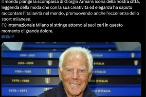 国米官方写道:“全世界都在为乔治-阿玛尼的离世而哀悼:他是我们城市的象征,是时尚界的传奇人物,以其创意与优雅将意大利精神传递到全世界,同时也推广了米兰城体育的卓越形象。”