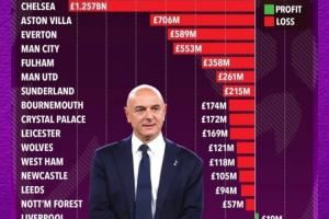 【盈利第一】英超俱乐部在列维时代的盈亏榜:热刺盈利1.67亿镑,排名英超第一!
